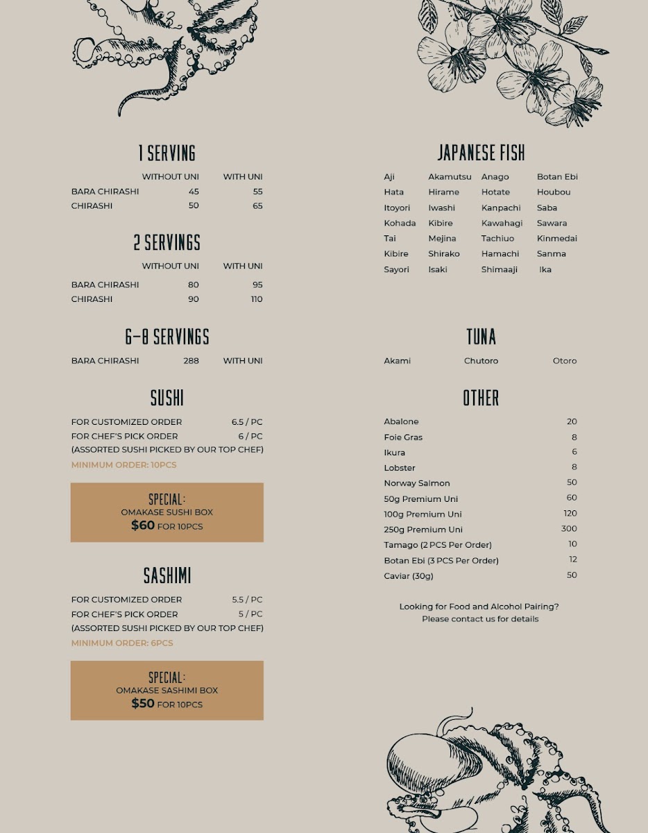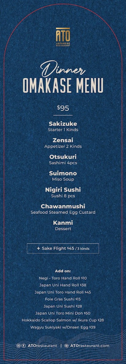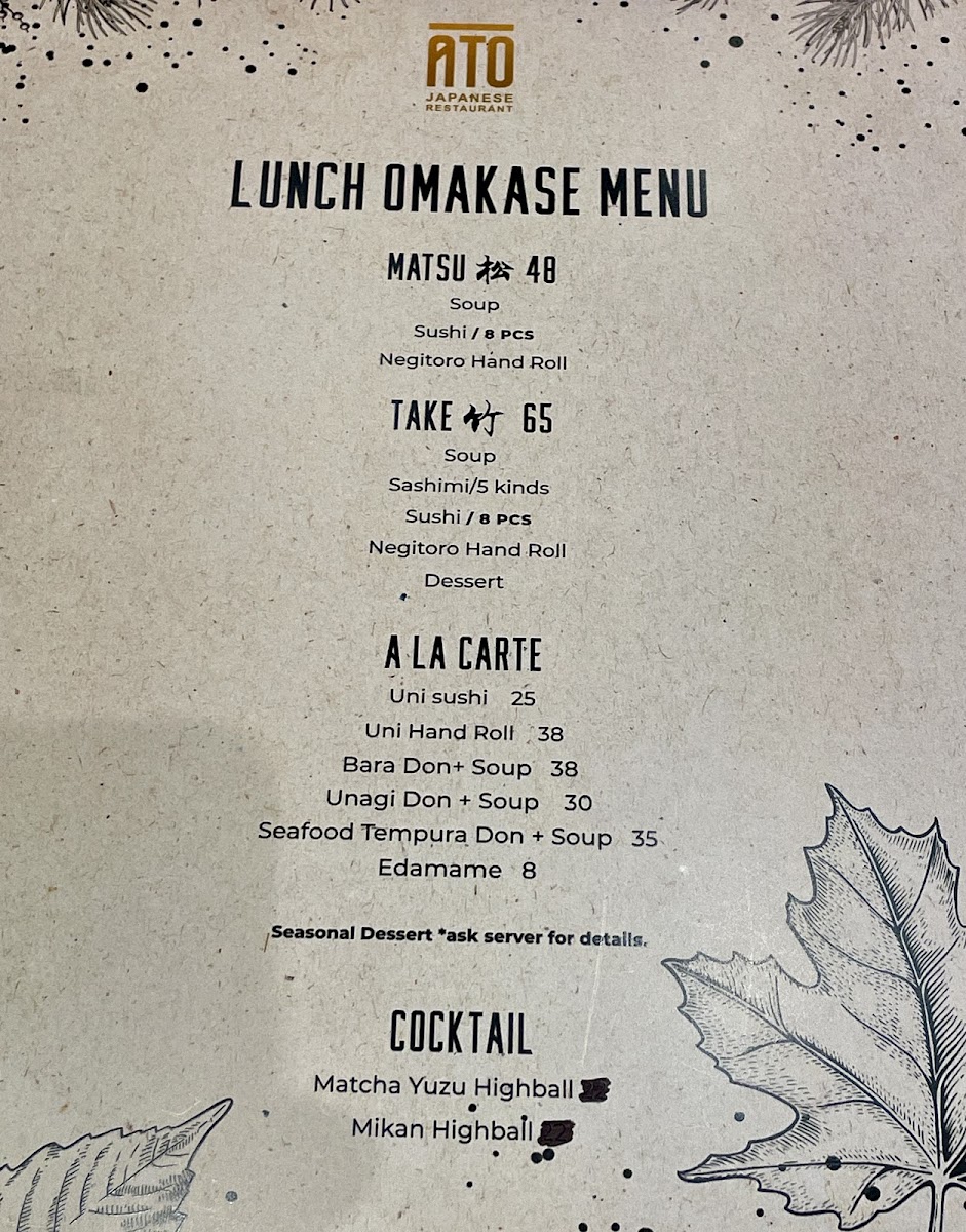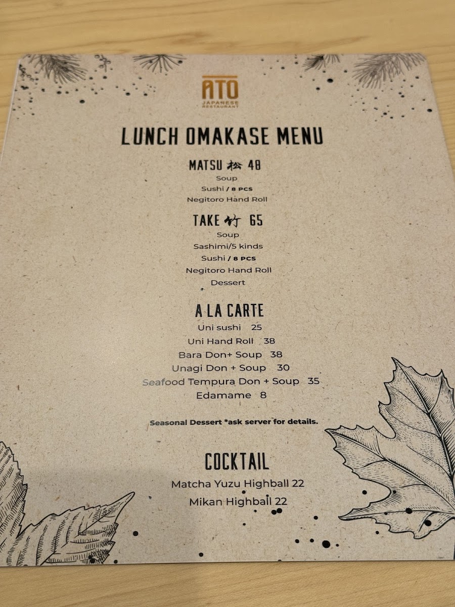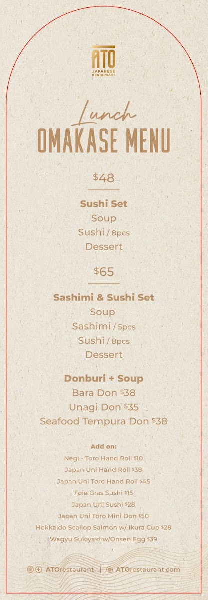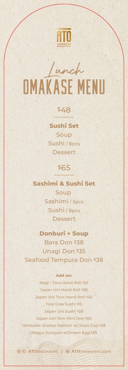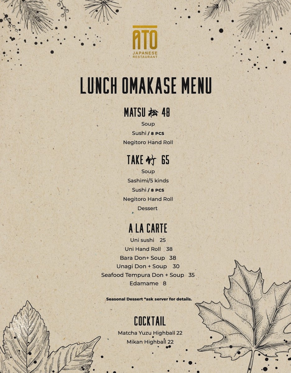As a final takeaway on the menu at Ato Japanese Restaurant in Richmond Hill, it’s clear that the kitchen is built around premium ingredients, careful craftsmanship, and a refined omakase-inspired philosophy. The seafood selection shines through offerings like Omakase Sashimi Box (Chef’s Pick) and Omakase Sushi Box (Chef’s Pick), where trust is placed in the chef’s daily choices to deliver peak freshness and balance. Rice bowls are another strong highlight, especially the chirashi options, including Chirashi With Uni, Chirashi Without Uni, Bara Chirashi With Uni, and Bara Chirashi Without Uni, each presenting a generous and visually appealing assortment of sashimi layered over seasoned rice, with uni adding a rich, creamy depth for those seeking a more luxurious experience. From the kitchen, the menu leans confidently into indulgence with thoughtfully composed rice boxes such as Wagyu, Uni & Black Cod Rice Box (Double Serving), Wagyu & Black Cod Rice Box (Double Serving), Wagyu & Uni Rice Box (One Serving), Wagyu Rice Box (One Serving), and Miso Black Cod Box (One Serving), all of which emphasize bold flavors, buttery textures, and comforting warmth. To round out the experience, the maki selection keeps things simple and classic, featuring Otoro, Cucumber, TunaHamachi, and Salmon, allowing the quality of the fish to speak for itself without unnecessary embellishment. Overall, the menu feels focused and intentional, successfully balancing raw and cooked dishes while showcasing high-end ingredients in both traditional and contemporary formats, making it a satisfying conclusion to the dining experience at Ato Japanese Restaurant.
